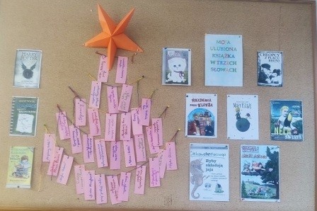 Na lekcjach bibliotecznych uczniowie mieli za zadanie określić swoje ulubione książki za pomocą trzech słów. Było to nie lada wyzwanie, ponieważ trudno jest ograniczyć się tylko do kilku słów, które oddają kwintesencję danej lektury. Efekty pracy zostały zaprezentowane na gazetce przy bibliotece szkolnej, którą przygotowali uczniowie z aktywu bibliotecznego.